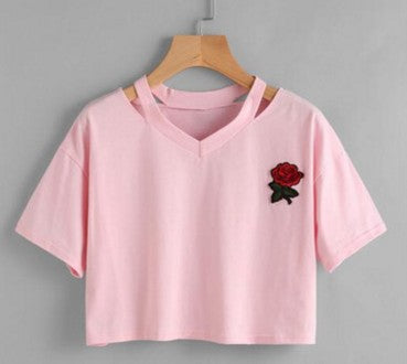T-Shirt Crop da Donna con Rosa Ricamata