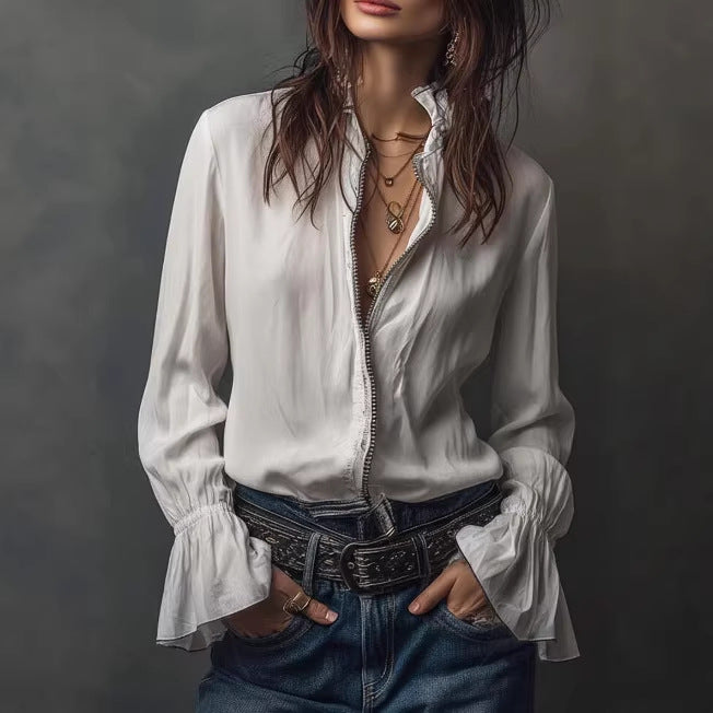 Camicia donna manica lunga con chiusura zip e collo rotondo